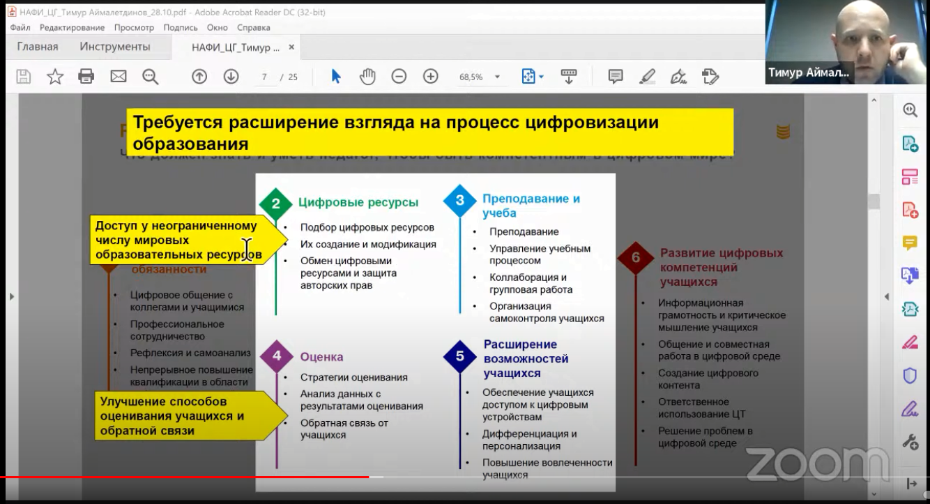 Вебинар посвящен цифровым компетенциям современного учителя, новым требованиям к учителям в рамках обновления профессионального стандарта педагога, а также новой компетенции «Цифровой педагог», которая разрабатывается в настоящее время Центром оценки квалификации СПК в области образования для глубокой проверки цифровых компетенций учителей страны с целью выстраивания системы профессионального роста педагогов в области применения цифровых технологий.